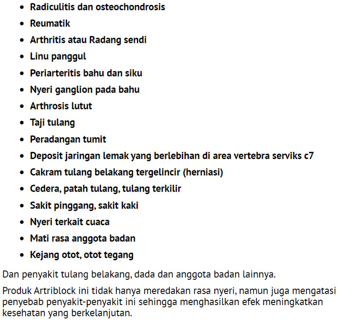 Artriblock adalah produk unik yang dikembangkan untuk melawan berbagai penyakit sendi. Produk ini memiliki berbagai kegunaan dan dapat membantu mengatasi masalah berikut: